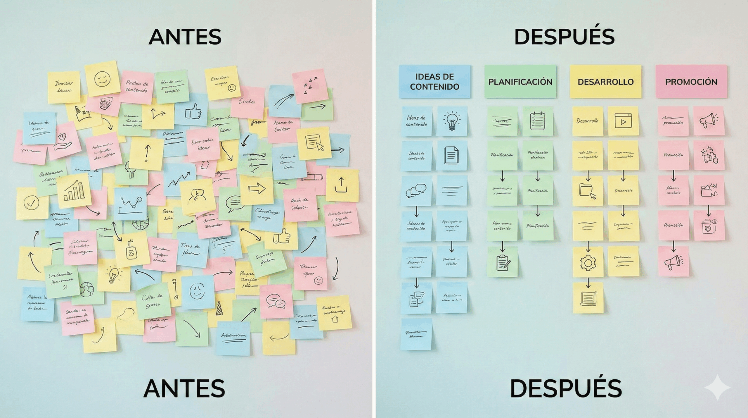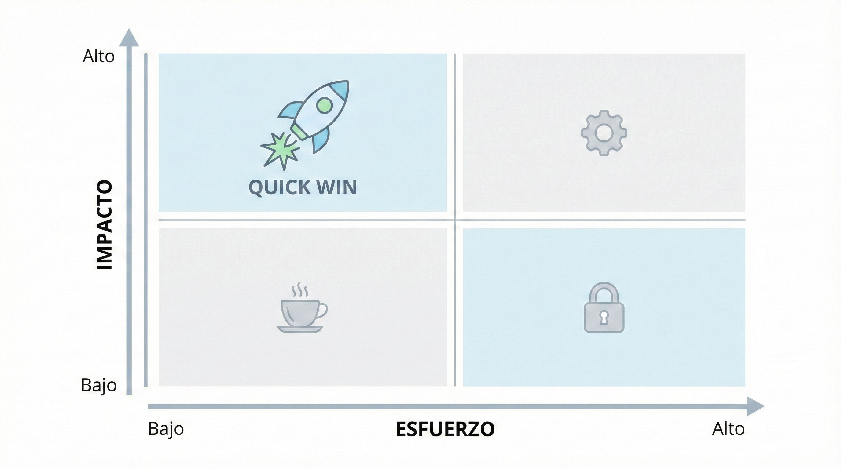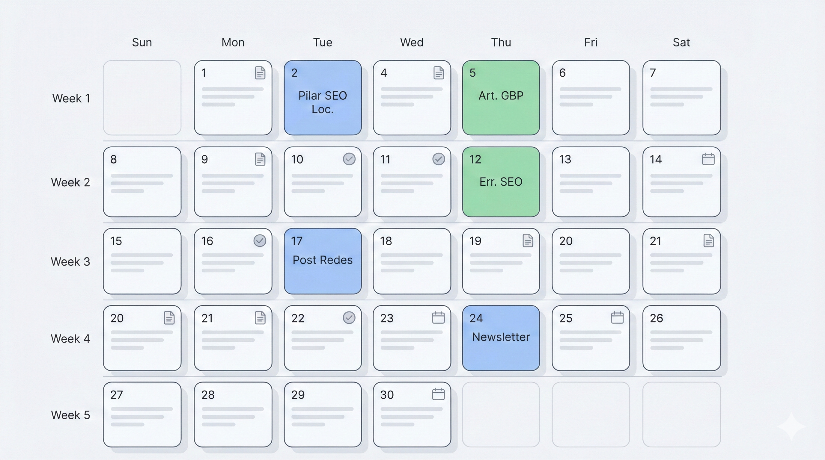 Cuando por fin tienes tus clusters claros, toca priorizar. Impacto vs esfuerzo. Qué se hace primero, qué puede esperar. Y solo entonces conviertes todo eso en un calendario editorial: qué se publica cada semana, cómo se reparte por canales, qué contenidos alimentan qué ofertas.