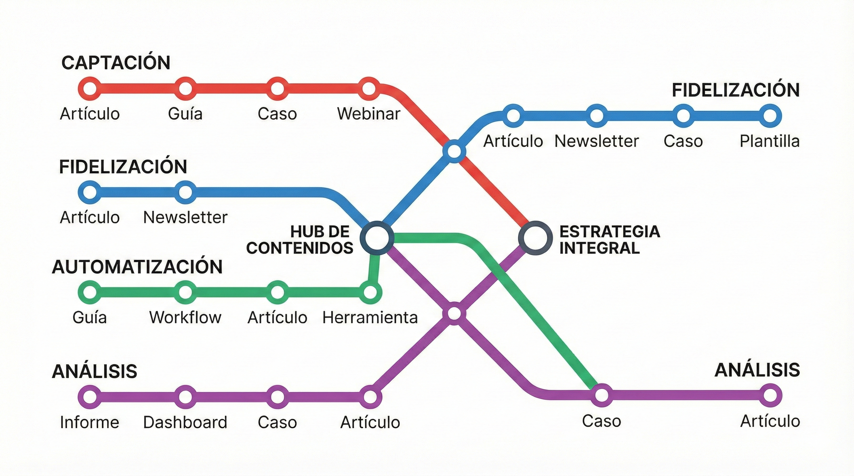 - Cómo pasar de «publicar cosas» a tener un mapa de temas que tenga sentido de negocio.