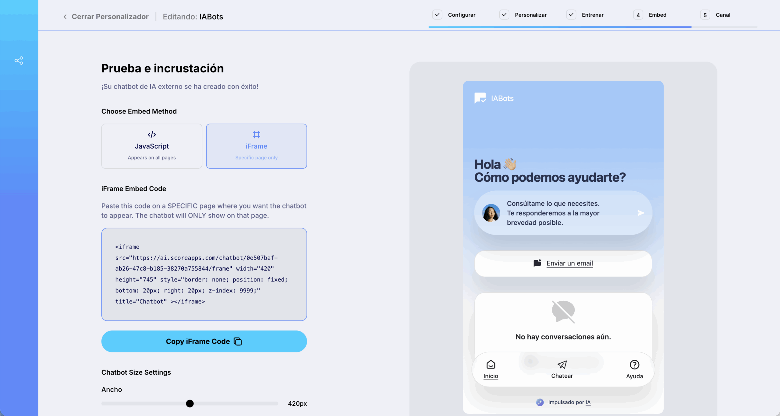 Añadimos una nueva opción de embed mediante iFrame, además del método JavaScript tradicional. La diferencia es importante: mientras el script global hace que el chatbot aparezca en todas las páginas donde se inserta, el iFrame permite mostrarlo solo en una página concreta. Es ideal para páginas de contacto, soporte, campañas o landings específicas.