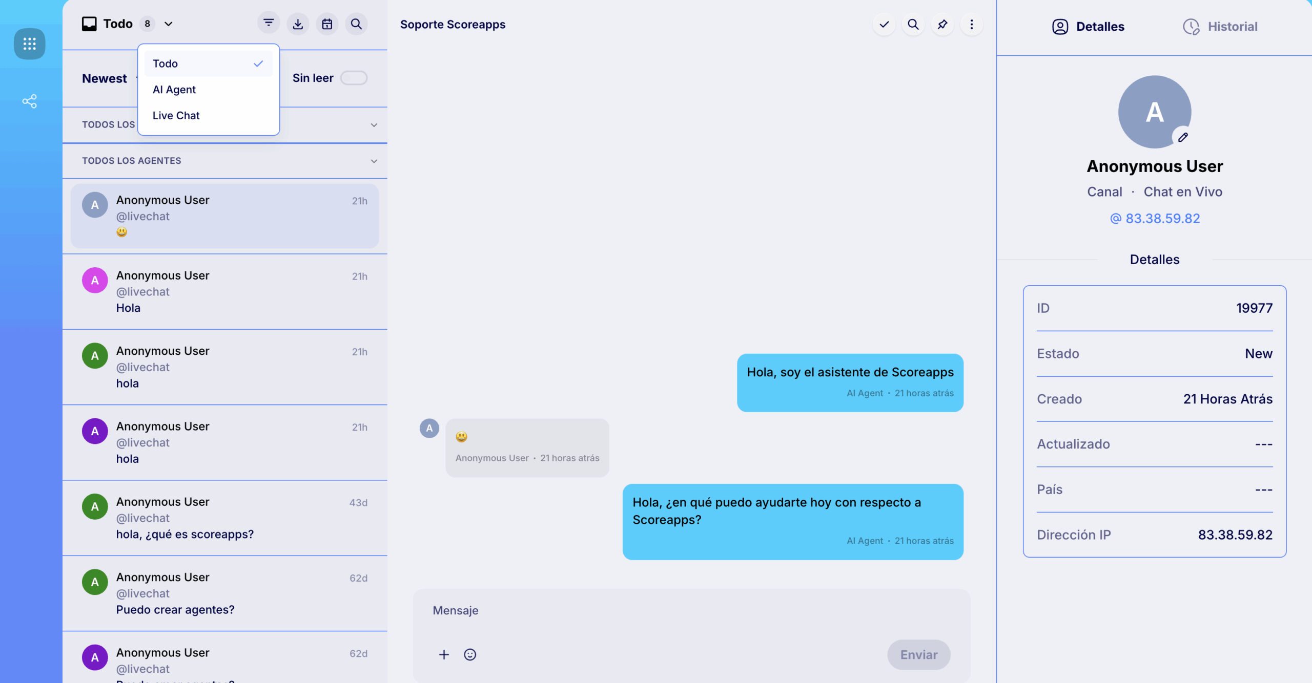 También hemos incorporado nuevas opciones para filtrar conversaciones por chatbot, fechas, canal, estado o tipo de agente, y exportarlas en PDF o Word. Esto resulta especialmente útil para equipos que quieren revisar conversaciones, documentar casos o compartir información internamente.