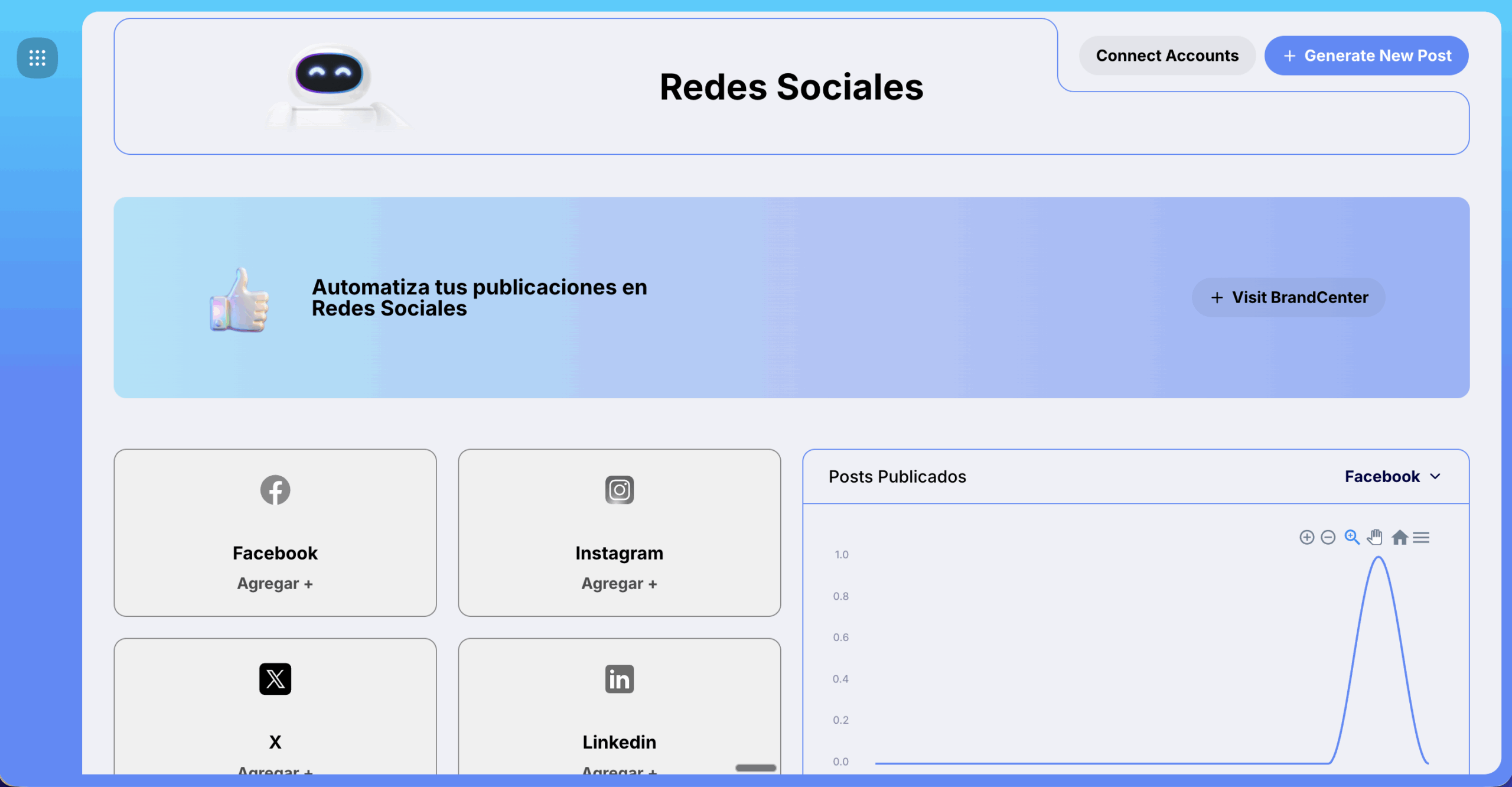 Para Redes Sociales, solo tienes que acceder a tu panel, ir al área de IA y entrar en la sección correspondiente. Desde ahí podrás conectar tus cuentas de LinkedIn y X, definir tu voz de marca y empezar a generar y programar publicaciones. Te recomendamos comenzar con un par de temáticas claras y un calendario sencillo (por ejemplo, dos publicaciones a la semana) para ver resultados rápidos sin complicarte.