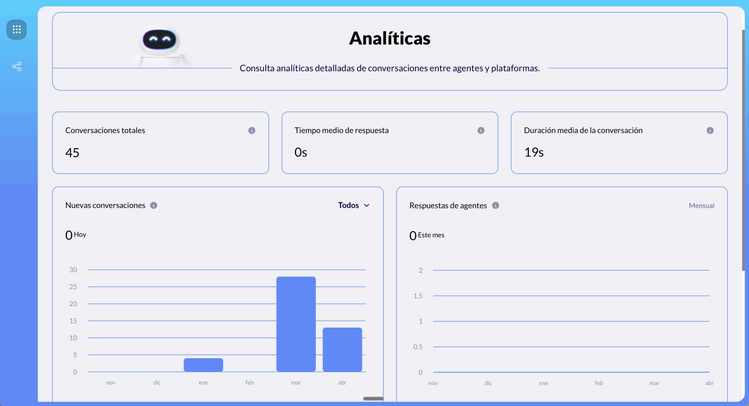 Esta actualización también incorpora una nueva sección de analíticas, diseñada para darte una visión más clara del rendimiento de tus agentes y de la actividad conversacional en distintos canales.