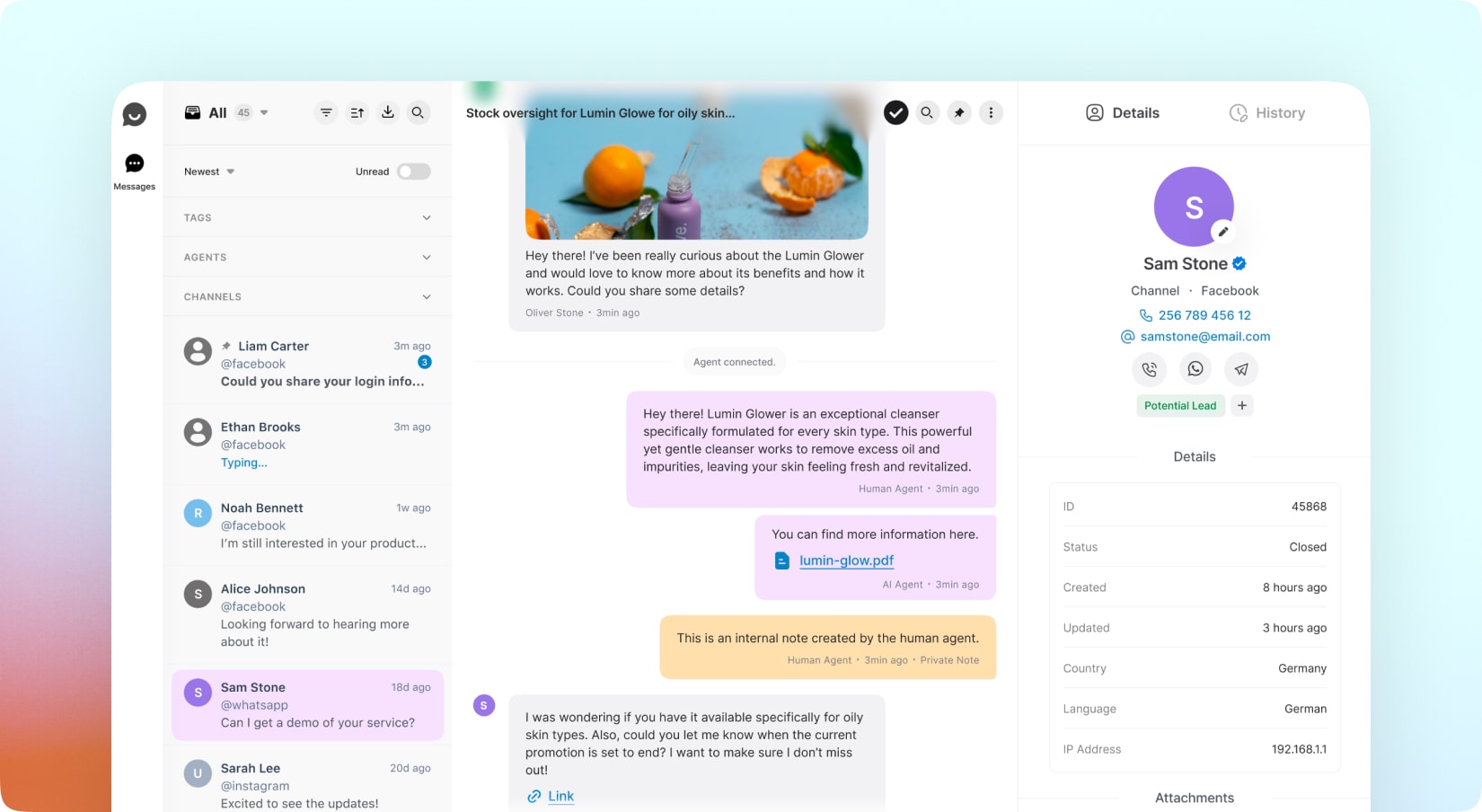- Notas internas privadas, visibles solo para agentes humanos, que ayudan a coordinar al equipo y dejar contexto útil dentro de cada conversación.