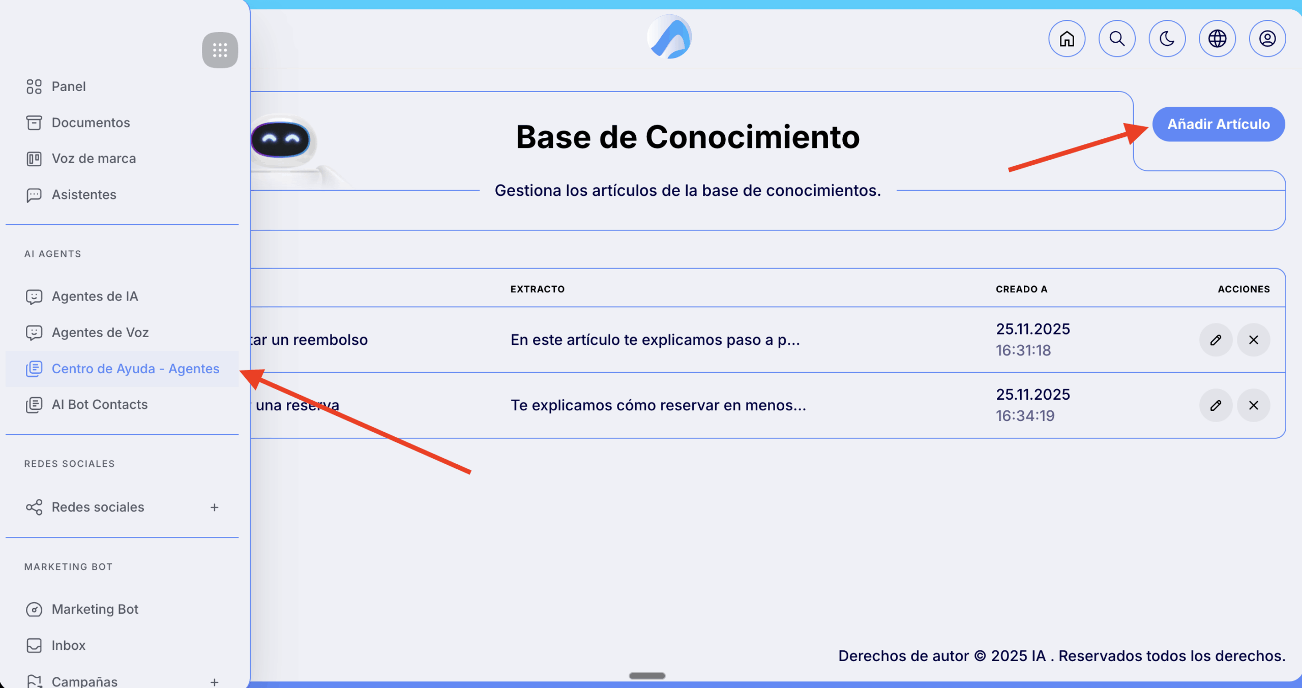 Cada Agente de IA puede tener ahora su propio mini helpdesk interno, con artículos asociados solo a ese agente.